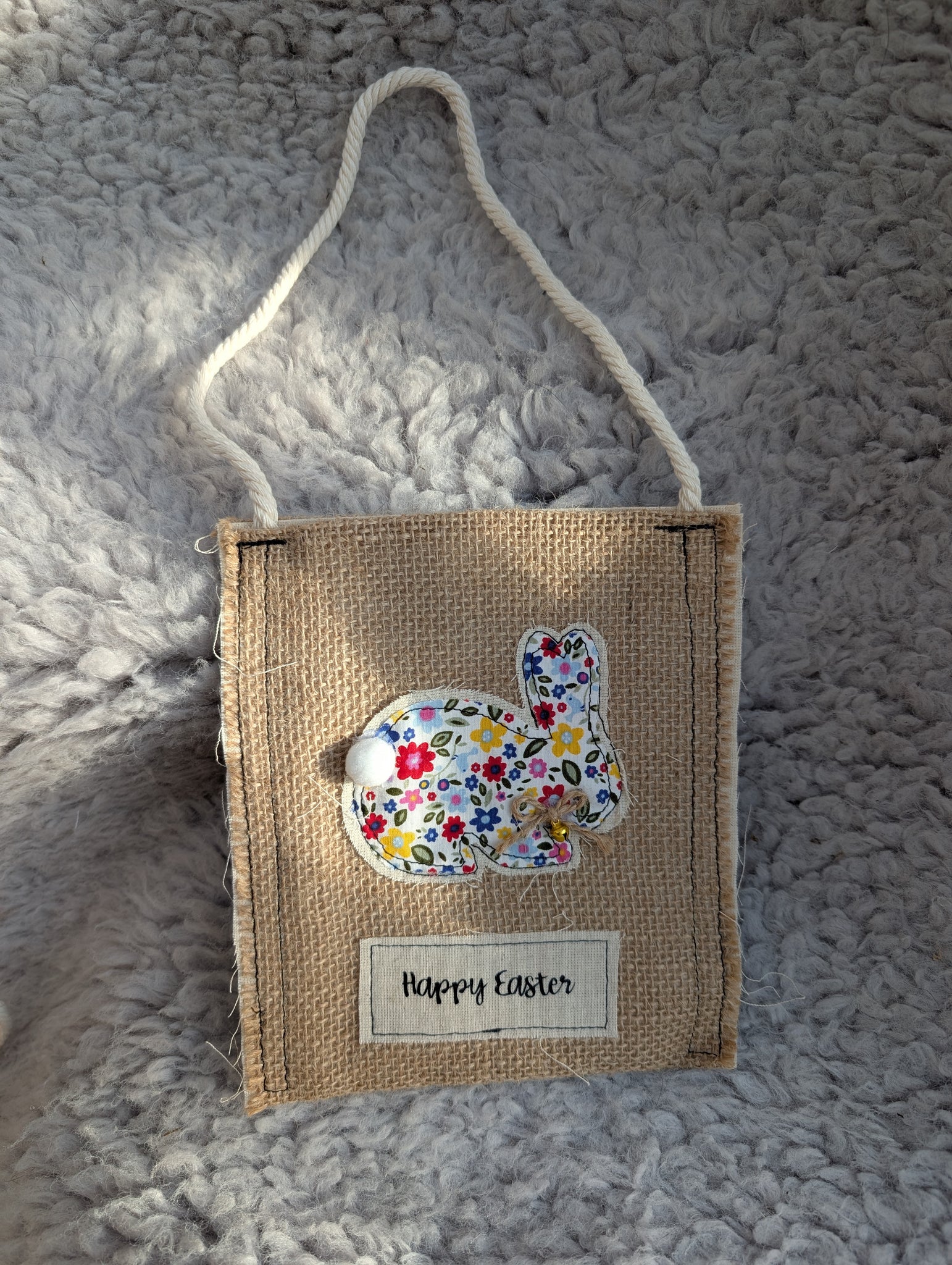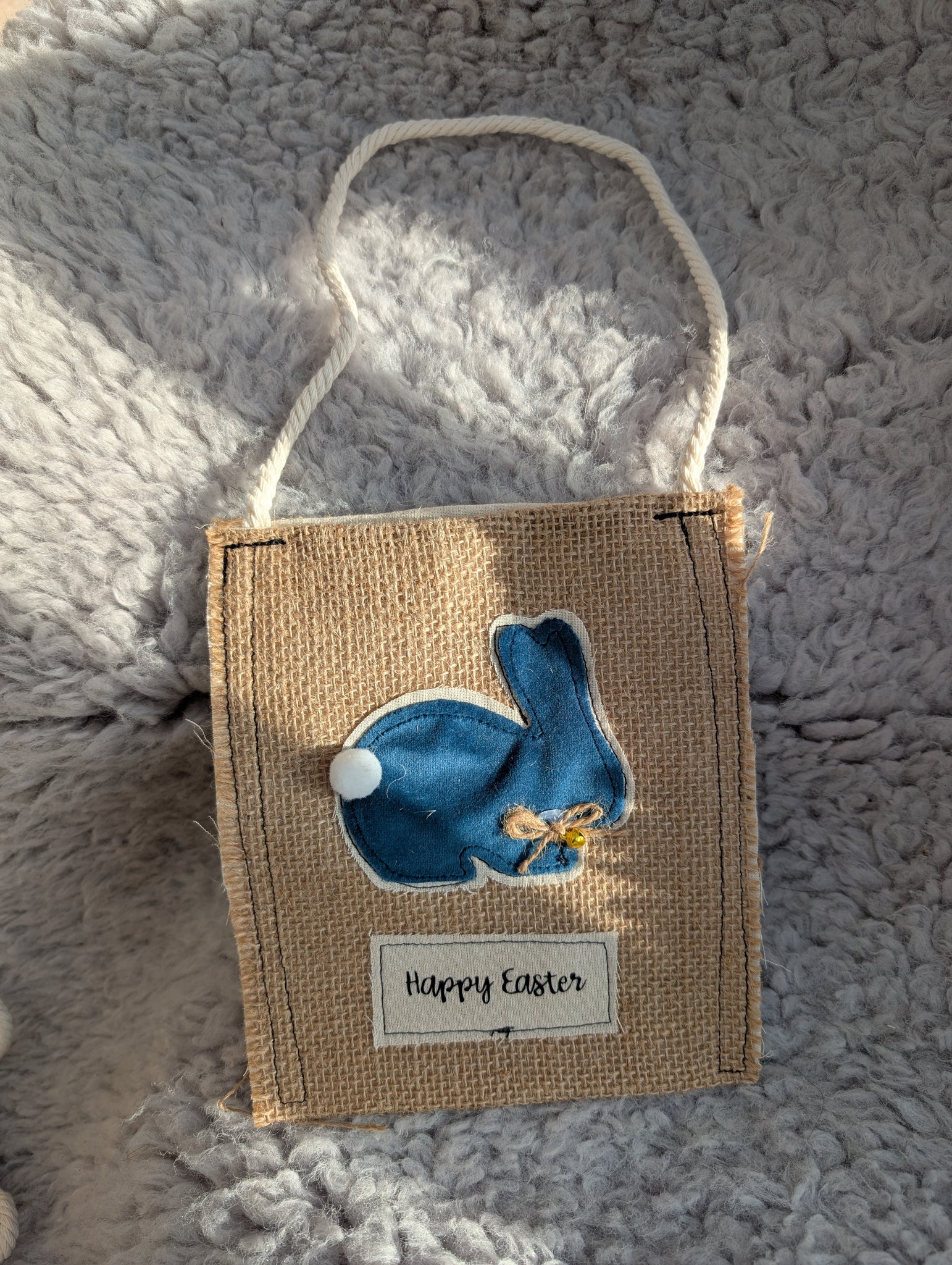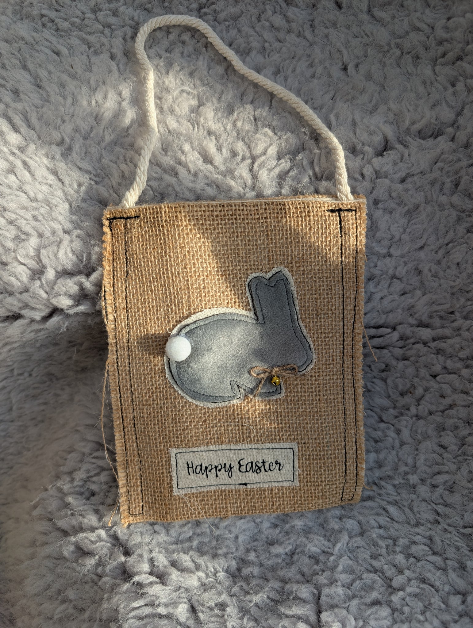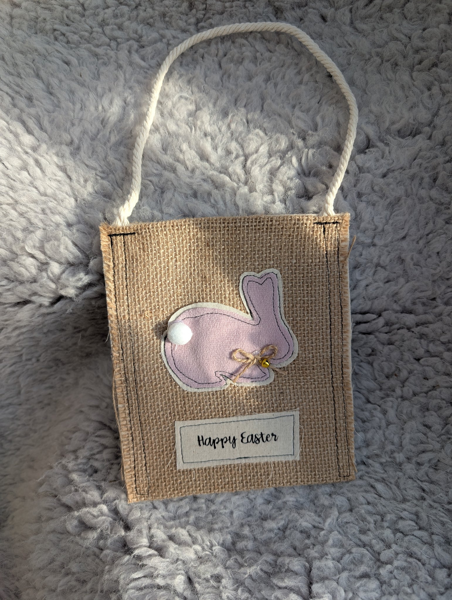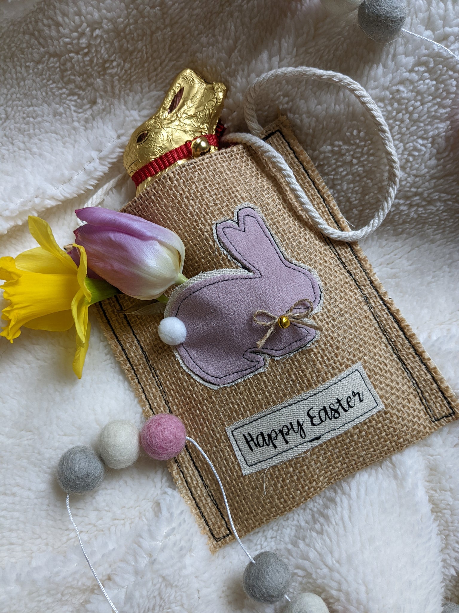 Sweet little Hessian bag with a velvet bunny pocket on the front, fully personalisable and perfect for adding in yummy Easter treats!